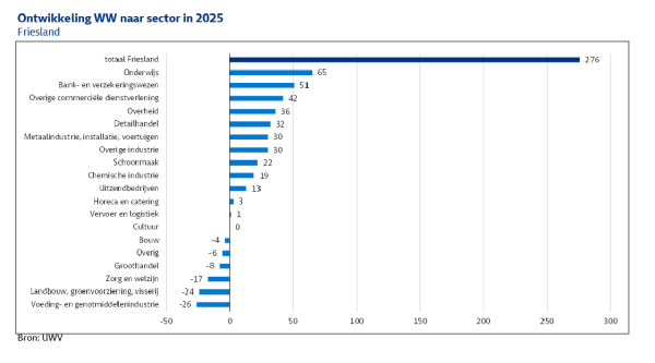 De ontwikkeling van de WW-uitkeringen in Friesland in 2025 verschilt naar sector. Vooral in sectoren als het onderwijs en het bank- en verzekeringswezen was sprake van een toename van het aantal WW-uitkeringen. In het onderwijs draagt vooral de daling van het aantal leerlingen bij aan de toename van het aantal docenten met een WW-uitkering. Ook het stopzetten van subsidies heeft invloed op de werkgelegenheid in het primair en voortgezet onderwijs. Zo liepen in het schooljaar 2024 -2025 de subsidies van het Nationaal Programma Onderwijs (NPO) af. Banken en verzekeringsmaatschappijen hebben al jaren te maken met afnemende werkgelegenheid als gevolg van digitalisering en het sluiten van regionale kantoren. Ook de opkomst van Artificial Intelligence zorgt voor ontslagen in de sector.